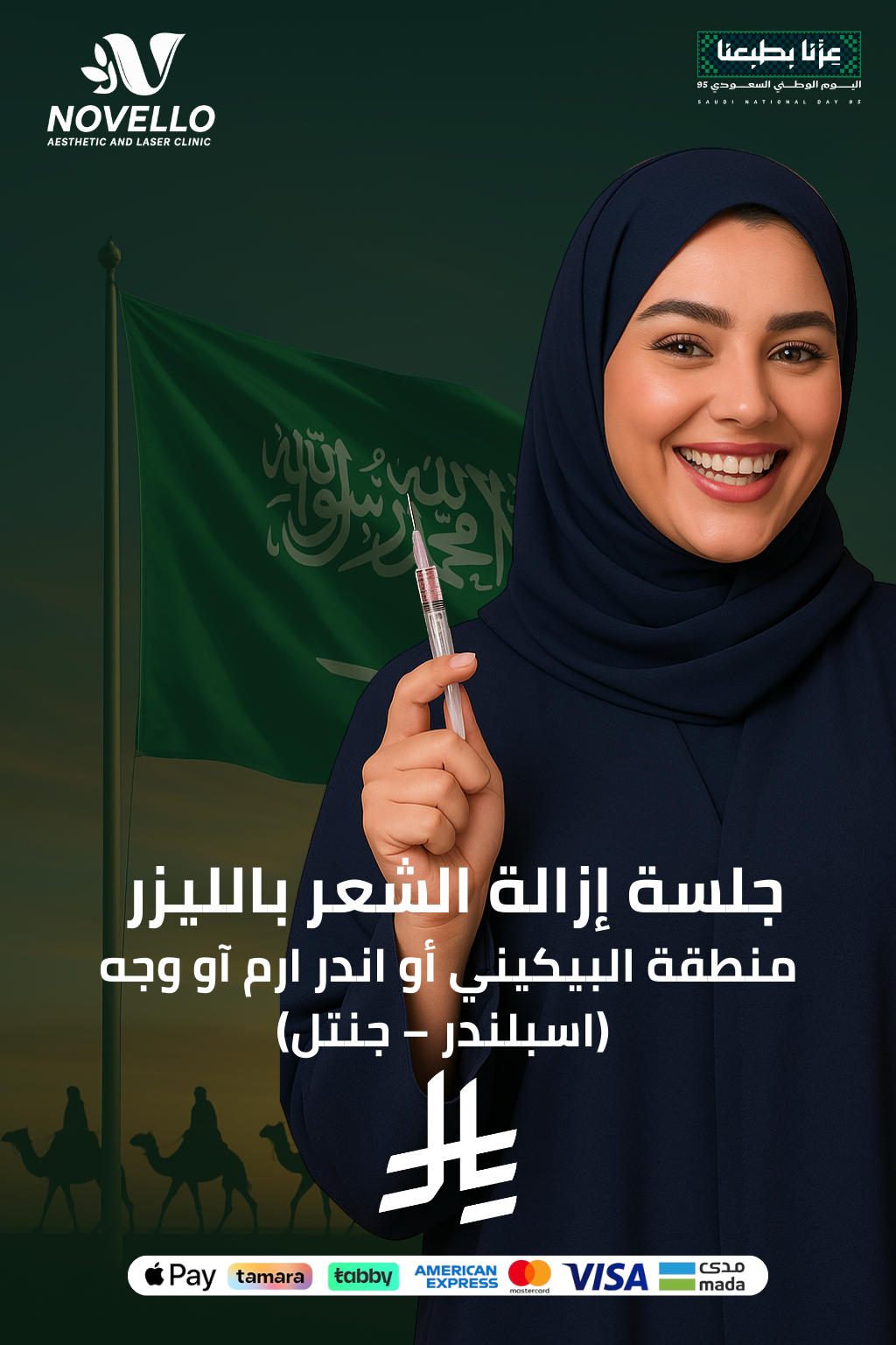 جلسة ليزر لإزالة الشعر من منطقة محددة مثل البيكيني، الأندر آرم أو الوجه داخل نوفيللو – الرياض، باستخدام أجهزة متطورة (اسبلندر – جنتل) اللي تناسب كل أنواع البشرة.